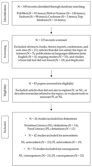 As for antecedents and consequences, we checked the sentences that described predictors of FL and NL (i.e., ‘a number of factors are suggested to be associated with the decline and devaluing of food literacy components such as cooking within the population [] (p. 158)’; ‘cognitive difficulty was inversely related to nutrition literacy [] (pp. 427–428)’) and the outcomes of FL and NL (i.e., ‘food literacy may influence adolescents’ dietary intake [] (p. 824)’; ‘a significant relationship were found between five of the six domains of nutrition literacy and diet quality [] (p. 493)’). We did not include any additional records identified through other sources (e.g., reference lists) because we considered the list of the studies collected sufficiently wide for the purpose of this research.