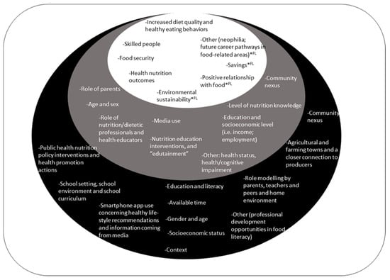 In terms of the subject, Guttersrud et al. [] described the NL construct moving from a personal to a population perspective. Regarding the context, Doustmohammadian et al. [], Guttersrud et al. [], and Escott-Stump [] described the nutrition environment as a situation in which a person interacts and spends time with a nutritionist or expert. The authors of seven papers discussing FL adopted both individual [,,] and wider perspectives [,,,]. Additionally, Vidgen and Gallegos [] and Cullen et al. [] described individuals’ FL as developing across the lifespan.