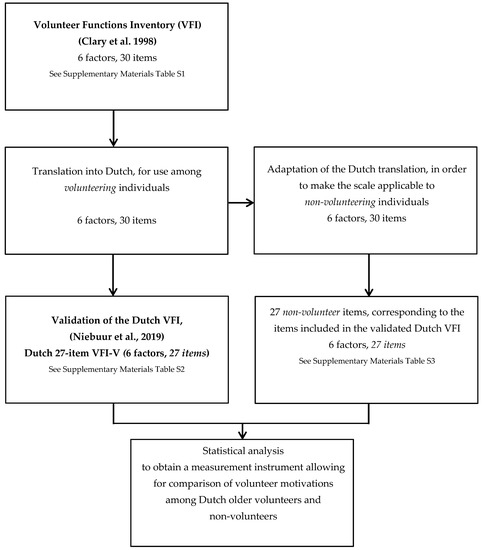 - Niebuur, J.; Liefbroer, A.C.; Steverink, N.; Smidt, N. Translation and Validation of the Volunteer Functions Inventory (VFI) among the General Dutch Older Population. Int. J. Environ. Res. Public Health 2019, 16, 3106. [Google Scholar] [CrossRef] [PubMed]