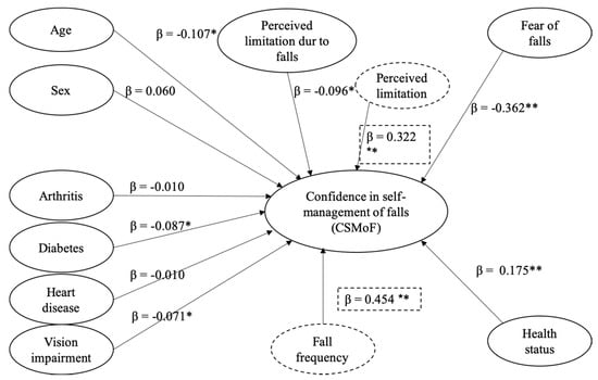 Conceptual model of the regression outcome that demonstrates the relationship between confidence in self-management of falls (CSMoF) and its predictors included in the final model. Note. Dashed-line circles and boxes refer to interaction variables. * p < 0.05, ** p < 0.01.