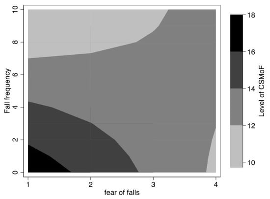 The interaction effect between fall frequency and fear of falls on the level of CSMoF. Note: The darker shaded areas stand for higher levels of CSMoF and lighter areas for lower levels of CSMoF.