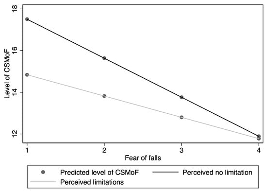 Similarly, the interaction term between perceived functional limitation and fear of falls predicted level of CSMoF, F(3687) = 0.322, p = 0.009 (see Figure 3 for visual representation of the interactional relationship). This means that older adults who self-perceived with no functional limitations and lower levels of fear of falls reported a higher level of CSMoF compared to those who self-perceived with functional limitations. When the fear of falls increases, the level of CSMoF decreases more drastically among older adults who self-perceived limitations due to falls, compared to those who did not.