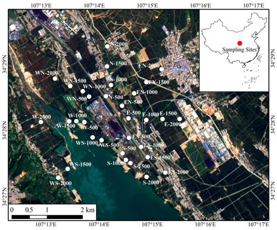 To verify if our model could address the practical problems, we chose an industrial zone in the western region of the Guanzhong area, Shaanxi province, China, as the study area. The geographical environment of the study area is described below. In general, it is a narrow and long shape, and the terrain is high in the middle and low on both sides. The altitude difference is about 200 m, and the total area is about 20 km2. There are two reservoirs interconnected by a river in the northwest and southeast direction, respectively. The dominant wind direction is southeast wind and the secondary prevailing wind direction is north. The study area typically has a continental monsoon climate zone. The meteorological records show that the annual mean temperature is 11.2 °C, the average annual precipitation is 616.3 mm, and the average annual evaporation capacity is 1202.1 mm. The meteorological data collected in the past three years show that the mean wind speed is 2.19 m/s and the maximum wind speed is 19.0 m/s. A lead and zinc smelter and a thermal power plant are located in the region. In our study, we chose 32 sampling points in the soil. These 32 sampling points are distributed outside of the lead and zinc smelter in eight different directions (east, south, west, north, southeast, southwest, northeast, and northwest). Hence, there are four points in each direction. The distance between the point which is nearest to lead and zinc smelter and the wall is 500 m. The distribution regulation of the left three points in one direction is 1000 m, 1500 m, and 2000 m to the wall of the lead and zinc smelter, respectively. The study area and the 32 sampling points are shown in Figure 3 in detail. In addition, we have conducted several batches of sampling events for the raw ore of lead and zinc smelter, the raw coal of a coking plant and power plant, and the background value of this area. Average values of several replicates in each lead pollution sources are used. Additionally, the background value of the area is considered as a lead pollution source.