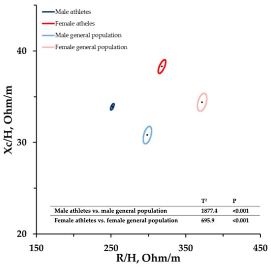 The present study, for the first time, generates BIVA reference data for the male and female athlete populations and for endurance, velocity/power, and team-sports athletes. The different distributions of the athletes’ bioelectrical values compared to the general population is indicative of the athletes’ BC peculiarities and shows the need for athlete-specific reference values. The differences in the BIVA distributions between athlete groups and the general healthy population might reflect the sport- and training-specific adaptation of body masses and composition. In fact, the athletes’ lower R/H and higher Xc/H values compared to the general population indicate a higher ICW/ECW ratio and FFM, which is typical for athletes [24,25].