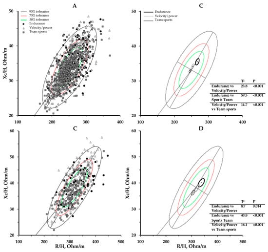 The mean impedance vectors of the three categories of athletes showed significant differences between each other (p < 0.01). Similarly, male and female endurance athletes showed longer impedance vectors than the athletes included in the velocity/power and team-sports groups, which were respectively lower in the R–Xc graph (Figure 3B,D).