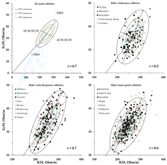 New 50%, 75%, and 95% tolerance ellipses of the entire male athlete population and for the endurance, velocity/power, and team-sports categories with the single athletes’ vectors. r = correlation coefficient between R/H and Xc/H. ICW/ECW: intracellular/extracellular water ratio.