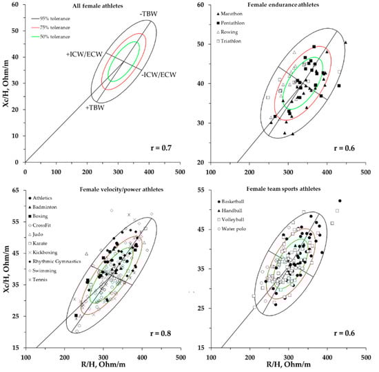 New 50%, 75%, and 95% tolerance ellipses of the entire female athlete population and for the endurance, velocity/power, and team-sports categories with the single athletes’ vectors. r = correlation coefficient between R/H and Xc/H.