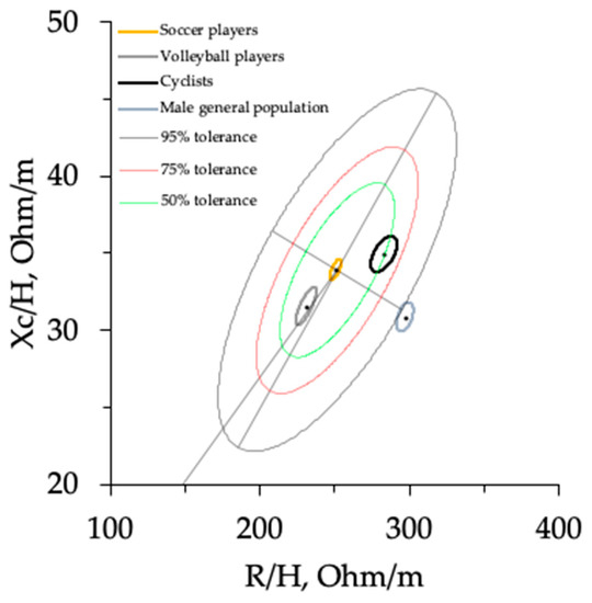 The 95% confidence ellipses for the mean impedance vectors of elite male soccer players [12] (n = 219, R/H = 252.1, SD = 23.1, Xc/H = 33.9, SD = 4.1, r R/H; Xc/H = 0.69), volleyball players [14] (n = 75, R/H = 232.1, SD = 24.1, Xc/H = 31.5, SD = 4.3, r R/H; Xc/H = 0.81), and cyclists [13] (n = 79, R/H = 284.5, SD = 31.4, Xc/H = 34.9, SD = 4.1, r R/H; Xc/H = 0.56) plotted on the new reference tolerance ellipses are shown in Figure 6. Separate 95% confidence ellipses indicate a significant vector difference (p < 0.05).