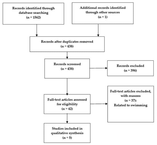 The keywords and/or combinations used for the search were in-water, aquatic, wearable, sensor, accelerometer, gyroscope. As an initial search strategy, the title, abstract, and keyword fields of the text were first identified and read carefully for a first selection of the journal articles. If one of these fields (title, abstract, and keywords), was not clear about the topic in analysis, the complete article was read and fully reviewed to ensure its inclusion. After deleting all unrelated and duplicated articles (and also excluding all articles related to swimming), five articles were included in the final review published until June 2018 (Figure 1). From such articles, the reviewers extracted information about the purpose of the study, the participants, characteristics of the sensor(s) used, the body area where the sensor was allocated, the variables measured, and the data analysis used.