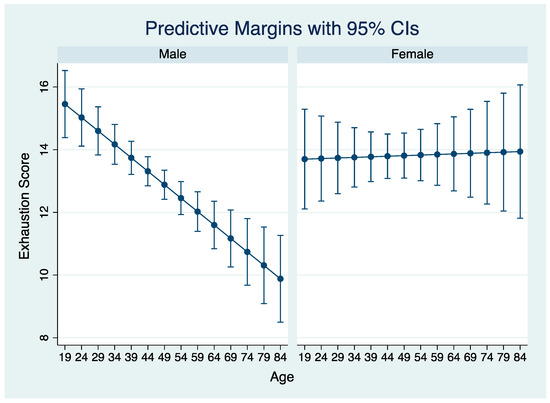 Predicted Maslach Burnout Inventory–General Survey exhaustion score by participant gender and age from a multivariable linear regression using data from 895 participating farmers in Canada (September 2015–February 2016).