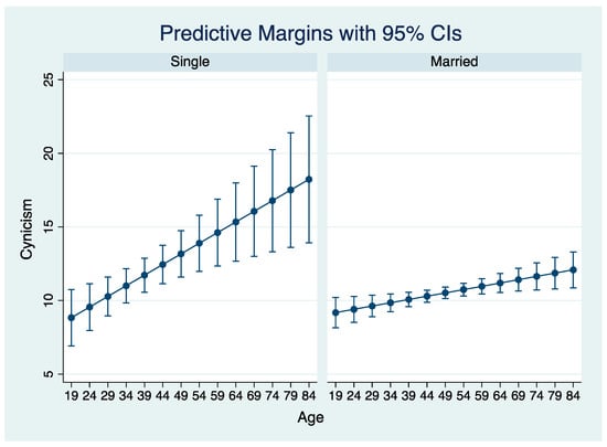 Predicted Maslach Burnout Inventory–General Survey cynicism score by participant gender and marital status from a multivariable linear regression using data from 876 participating farmers in Canada (September 2015–February 2016).