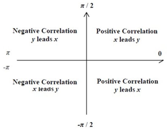 In [14], it is proved that the phase difference between the time series and can be used to measure the lead-lag relationship between the two at a specific time frequency. The phase difference is defined as the ratio of the imaginary part to the real part of the cross wavelet power , expressed as follows: