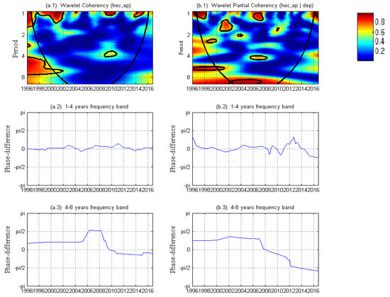 After adding the control variable, as in Figure 2(b.1), short-term (one- to four year) effects were found from 1997 to the end of 1999, in the middle of 2000 and 2002, and from 2006 to the third quarter of 2007, and there was a more significant positive correlation (correlation coefficient > 0.6). Positive long-term (four to eight years and more than eight years) correlations were found in 2000 and from 2002 to the beginning of 2008 (correlation coefficients > 0.7 and 0.5, respectively). After 2008, there was almost no linkage correlation in the long or short- term.
