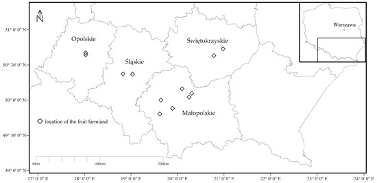 Fruit sampling site locations in the regions of southern Poland (modified from [13]).