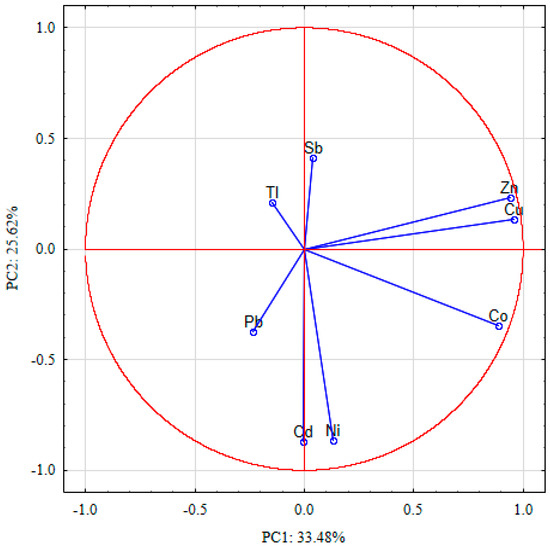 The principal component analysis (PCA) was performed on the PHE contents in 87 analyzed fruits samples. Results revealed four principal components (PCs), with eigenvalues higher than 1, which altogether explained 88.6% of the variance observed (Table 4). The first principal component (PC1), which accounted for 33.5% of the variance, had high positive loading values (>0.7) for Cu, Zn, and Co. That high positive correlation with the three PHEs corresponded to the highest uptake of essential elements, i.e., Cu and Zn [35] and beneficial elements, i.e., Co [36], as compared to other PHEs. The second principal component (PC2) explained 25.6% of the variance and had high negative loading values of Cd and Ni. That could be correlated with the total concentration of PHEs in soil, as in the cases of Cd and Ni where the negative correlation might indicate that bioavailable element concentration in soils determined element uptake and accumulation by plants [14,37,38]. Moreover, Cd and Ni are characterized by easy bioaccumulation from soil [37,39,40,41,42].