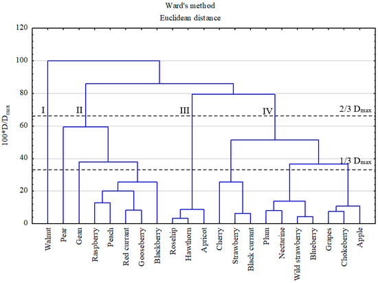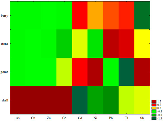 A hierarchical dendrogram distinguished four similarity groups of variables, according to the Sneath’s criterion equal to 2/3 of the maximum distance (Dmax) (Figure 3). The first and second clusters could be associated with fruits containing the highest concentrations of Cu and Zn, and they are known as plants being rich in those microelements [1,51]. However, the concentrations of non-essential elements were also quite high, i.e., those of Ni and Pb. The first group was separated in respect of the walnut, which as shell fruit, since it contained one order of magnitude more of PHEs, especially of Zn and Cu [52], as compared Group II. The third and fourth clusters could be associated with the fruits containing relatively low concentrations of essential elements (i.e., Zn and Cu), but, at the same time, low concentrations of non-essential elements in Cluster III and high contents of toxic elements in Cluster IV. For a better visualization, standardized PHE contents in specific group of fruits were also presented on a color scale map (Figure 4). The map revealed that the walnut was abundant in Cu, Zn, Co, and As (the only investigated fruit for which the As contents were >LOD). The highest abundance of Ni, Sb, and Cd was observed in pome fruits; that of Pb, Tl, Cd, and Sb in stone fruits, and that of Cd, Pb, Tl, and Ni in berry fruits.