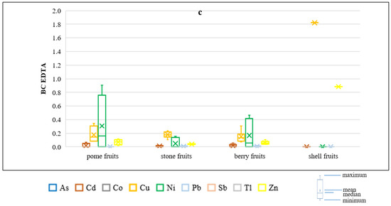 To determine the efficiency of PHE uptake by the investigated fruits BA and BC coefficients were calculated since soil is the main source of elements for plants. Numerical data of the distribution of calculated transfer index values are presented on the box and whisker chart in Figure 5. The bioconcentration coefficient (BCF1) values were not calculated for Hg and Pb, since the contents of those PHEs in soil samples were found to be <LOD after the first step of the BCR extraction procedure (exchangeable and acid soluble forms) [13]. Besides, the bioconcentration coefficient (BCEDTA) values were not calculated for As, Co, Hg, Sb, and Tl, since those PHEs had not been determined in soil samples after the 0.05 mol/dm3 Na2EDTA extraction procedure [14]. Contents of PHEs in soils used for bioaccumulation indices calculations are collected based on results obtained in the previous research [13,14] and given combined in Table S4. Moreover, the bioaccumulation coefficient (BAtotal) values were not calculated for Cr, Hg, and Se because 100% of the fruit samples indicated the PHE concentrations of <LOD. All calculated BAtotal values were <1 (Figure 5a), indicating that none of the investigated fruits had potential for accumulating PHEs, taking into account the total element content in soil. Calculated BCEDTA values (with the exception of Cu in walnut) were also <1 (Figure 5c), which indicated that the investigated fruits had no potential of PHE accumulation when considering the available proportion of PHEs in soils extracted with the 0.05 mol/dm3 Na2EDTA. However, the analyzes of the BCF1 values calculated, with the use of available PHE proportion in soils, extracted with 0.11 M CH3COOH (the first fraction of the BCR sequential extraction procedure F1), revealed that the calculated mean BCF1 values were >1 (Figure 5b), which pointed the potential for accumulation of Cu in shell fruit (walnut), pome fruits, berry fruits, and stone fruits; Ni in pome fruits and berry fruits; Sb in pome fruits, stone fruits, and berry fruits; and Tl in stone fruits and berry fruits. The investigated groups of fruits were characterized by a similar level of the transfer factor. The highest accumulation potential for Cu and Zn in walnuts was disclosed by Cindrić et al. [52], since walnuts are known to be functional food and an important contributor in supply of essential elements to humans. Other fruits did not reveal any potential for accumulation because plants protect underground parts against the PHE accumulation [63,64]. While plants developed a biochemical mechanism for the PHE adaptation and tolerance in growth media, plant response might vary in various plant species and that should be investigated in particular soil-plant systems [39].