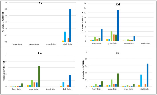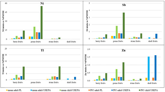 The calculated daily intake rate (DIR) values of the consumed PHEs, within the four analyzed groups of fruits, were compared to the tolerable daily intake of trace elements recommended by JECFA (Joint FAO/WHO Expert Committee on Food Additives), World Health Organization (WHO), and The United States Environmental Protection Agency (USEPA) guidelines. Using the provisional maximum tolerable daily intakes (PMTDI), the following values were adopted in the present study (mg/kg bw-day): As 0.0021 [65], Cd 0.0008 [66], Co 0.0014 [67], Cu 0.5 [68], Hg 0.0006 [69], Ni 0.005 [66], Sb 0.006 [70], Tl 0.00014 [71], and Zn 1 [68]. The PHE intake rates, calculated as a percentage of PMTDI (%PMTDI; Figure 6) revealed that, in the case of essential PHEs, the highest Zn and Cu intake values were identified in shell fruit, i.e., walnut, where the mean PHE values of concentration in plants were equal to 1.53% and 0.69% PMTDI, respectively, under the US adult intake scenario. In the group of non-essential elements, the highest intake was found in the cases of Ni (up to 55.2% of PMTDI in pome fruits) and Tl (up to approx. 8.50% of PMTDI in berry and stone fruits). As to the 95th percentile value of the PHE concentration under the US child intake scenario, the highest intake of Cd was also calculated (up to 13.2% of PMTDI at the 95th percentile of PHE concentration in pome fruits under the US adult intake scenario). In the cases of the remaining non-essential PHEs, the intake rates did not exceed several % of PMTDI. As to the mean contents of As in walnuts, the recommended walnut intake of 30 g per day corresponded to the 0.78% of PMTDI, and considering the 95th percentile of the As content, the same corresponded to the 2.50% of PMTDI.