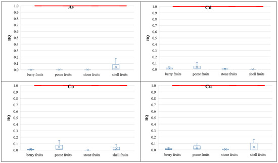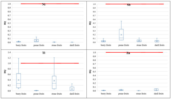 The target non-carcinogenic risk value described as hazard quotient (HQ) was set to be equal to 1 according to USEPA [7], as well as the Polish Regulation of the Minister of the Environment of 1 September 2016 on the conduct of the assessment of contamination of the surface of the earth [72]. A statistical characterization of the calculated HQ values is presented in Figure 7, involving the respective groups of fruits under the analyzed intake scenarios. For particular PHEs, the target HQ = 1 value was not exceeded, except for the Tl non-carcinogenic risk at the 95th percentile of Tl concentrations in berry (HQ = 1.18) and stone (HQ = 1.20) fruits, under the US child intake scenario. When analyzing fruit groups, the highest mean HQ values were observed in pome fruits: Sb (HQ = 0.19), Co (HQ = 0.05), Ni (HQ = 0.04), and Cd (HQ = 0.03). In each analyzed fruit group the total non-carcinogenic risk did not exceed the target value of 1 as calculated mean risk values were as follows: berry fruits HQ = 0.47, pome fruits HQ = 0.36, stone fruits HQ = 0.42, and shell fruits HQ = 0.22. Considering intake scenarios, the target total non-carcinogenic risk was exceeded at the 95th percentile of PHE contents in the US child intake scenario in following fruit groups: berry fruits (HQ = 1.43), pome fruits (HQ = 1.10), and stone fruits HQ = 1.36.