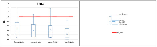 The small amount of investigated samples for particular fruit samples had an impact on the range as well as on the mean value of investigated PHE contents. The calculated risk values depend strongly on the assumed intake rates. No statistical data were available for children in Poland. The collected statistical data concerned adults and involved only the most popular fruits consumed by people. The attempted HHRA assumed that the investigated fruits constituted 100% of the PHE intake, excluding other ingestion sources, as well as other exposure pathways, i.e., dermal contact or inhalation.