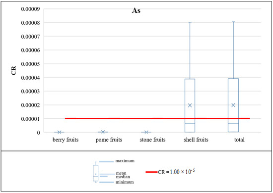 The acceptable carcinogenic risk (CR) level was set to be equal to 1 × 10−5, as defined in the Polish Regulation of the Minister of the Environment of 1 September 2016 on the conduct of the assessment of contamination of the surface of the earth [72]. In this study, only As was investigated as potentially carcinogenic, according to the current knowledge of the SF values regarding chemical substances. The statistical characterization of the calculated CR values for the walnut (since As contents were <LOD in other fruit species) is presented in Figure 8 under the analyzed intake scenarios. Under the adult intake scenario, in reference to the Polish statistical consumption rates, the acceptable carcinogenic risk for As was not exceeded for both mean (CR = 1.98 × 10−6) and 95th percentile (CR = 6.36 × 10−6) for the As content in walnuts. However, the acceptable carcinogenic risk level was exceeded for adults under the recommended 30 g of walnut consumption per day, in respect of both mean (CR = 1.67 × 10−5) and 95th percentile (CR = 5.36 × 10−5) for the As content in the shell fruit.