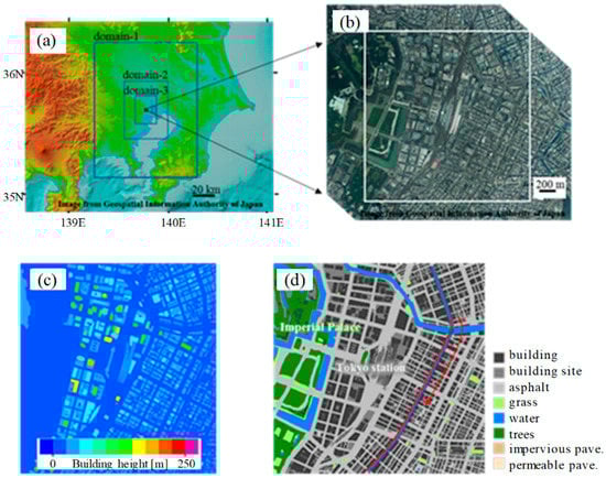 Figure 1 shows the computational domains for the present set of simulations. The mesoscale simulations adopted three two-way-coupled nested systems (Figure 1a), with horizontal resolutions of 1 km (domain 1), 300 m (domain 2) and 100 m (domain 3), centered at the urban simulation domain (Figure 1b). For all three nested systems, 55 vertical layers (lowest-layer height: 75 m) were used for the 40-km height domain. The boundary and initial conditions for the mesoscale simulations were obtained from the Japan Meteorological Agency (JMA) mesoscale analysis data.