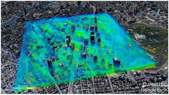 Figure 2 shows an example of the three-dimensional distribution of instantaneous air temperature at 14:30 JST on 7 August 2015. The “Volume Data Visualizer for Google Earth (VDVGE)” [24] was utilized for the visualization. The air was warmed up by the land surface, which was heated by solar radiation. The buoyant motion and the turbulent transportation of the warmed air formed the puffy structure of the temperature distribution.
