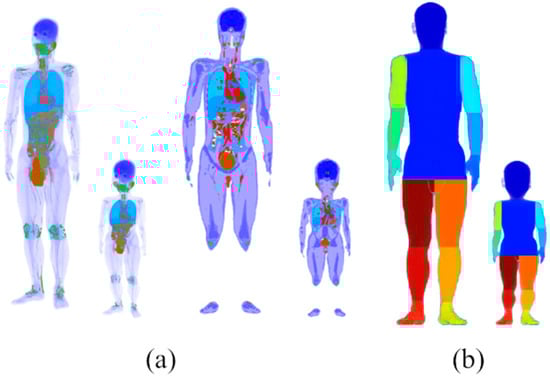 A Japanese male and three-year-old child models were used as references in this study [25,26]. The height and weight of the adult model were 1.73 m and 65 kg (5′ 8″ and 143.3 lb), respectively, whereas those of the child models were 0.90 m and 13 kg (2′ 11″ and 28.67 lb), respectively. The surface areas of the adult and child models were 1.78 m2 and 0.56 m2, respectively [25,26,27]. Figure 3 illustrates the anatomical human models and the definitions of body parts for computing the blood temperature. The latter body-part models are considered to approximately represent a compartment model (e.g., cylinders as in [28]), as often used for human temperature computation. We then increased the number of body parts from five [16] to thirteen, to more accurately simulate different limb temperatures [20].