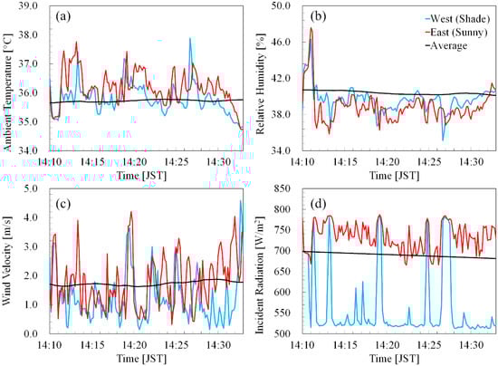 As shown in Figure 4, the domain-averaged values did not change much over time, whereas the values for the two pedestrian routes did change significantly. In terms of the incident radiation, the domain-averaged results were similar to the results for the sunny side route, because the sunny area was larger than the shaded area in the targeted period.
