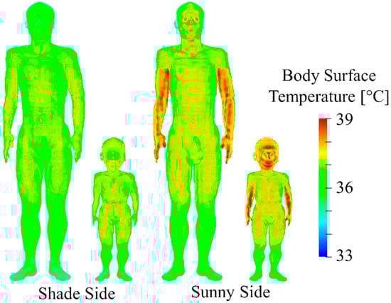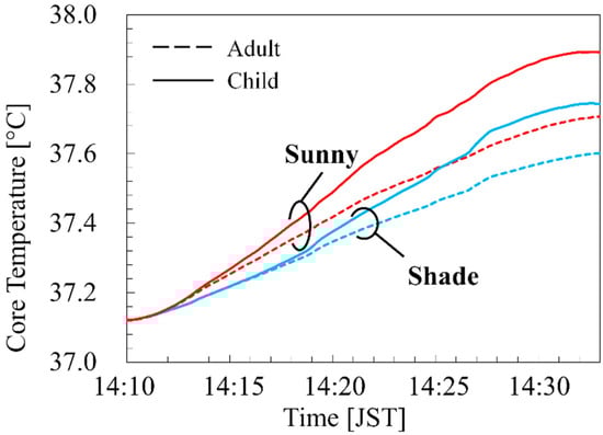 Figure 6 shows the time course of the body core temperatures in the models of the adult and child. As shown in Figure 6, the core temperature of the adult elevated by 0.59 °C and 0.48 °C for 23 min on the sunny and shaded sides, respectively, whereas those of the child elevated by 0.77 °C and 0.62 °C on the sunny and shaded side, respectively. The differences in the temperature elevation between the sunny and shaded sides were slightly higher in the child than in the adult.