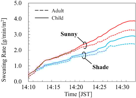 Figure 7 shows the time course of the sweating per surface area in the adult and child models. As shown in Figure 7, the water loss of the adult reached to 3.25 g/min/m2 and 2.38 g/min/m2 for 23 min on the sunny and shaded sides, respectively, whereas those of the child reached to 3.85 g/min/m2 and 2.88 g/min/m2 on the sunny and shaded side, respectively.