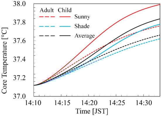To demonstrate the effects of the time-course ambient conditions, the same scenarios were simulated with a constant ambient temperature, i.e., one scenario is the domain-averaged thermal environment and the other is 36.79 °C on the sunny side and 36.25 °C on the shaded side, at 14:20 JST on 7 August 2015. Figure 8 shows the time course of the body core temperatures in the adult and child in the constant ambient temperatures for 23 min. As shown in Figure 8, the core temperature elevation with the domain-averaged thermal environment were 0.54 °C in the adult and 0.72 °C in the child. In addition, the difference in the body core temperature elevation between the sunny and shaded sides was 0.14 °C in the adult and 0.21 °C in the child.