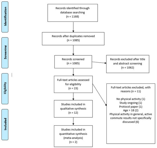 The study selection flowchart is shown in Figure 1. We identified a total of 1168 articles using the keyword search. After removing duplicates (n = 83), we screened 1085 articles for eligibility using title and abstract screening. A total of 1062 records were excluded, as they did not fit our inclusion criteria. Specifically, studies were excluded at this stage if they focused on physical activities conducted after school or during recess, or targeted perceptions of safety when commuting to school. A total of 23 articles were shortlisted for full-text review. After a thorough screening of these articles against the review protocol, 12 articles were included in the final synthesis. One study had an age range of 13–18.5 years, which slightly violated the inclusion criteria of below 18 years. However, we decided to retain this study because the mean age of the sample was 15.4 years, with a standard deviation of 1.3. One study that met all of our inclusion criteria was excluded because it was a protocol/methods article [31]. A forward and backward search was conducted, and no new articles were identified for inclusion. Therefore, 12 articles were included in the systematic review. The reasons for exclusion of studies were: physical activity measured in general and active commute results not specifically discussed [32,33,34,35,36,37]; age >18 [38,39]; no physical activity [40]; study currently ongoing (protocol published in clinical trials) [41]; and study protocol [31]. Figure 1 shows the study selection flowchart.