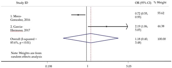 Figure 2 summarizes the results of ACS with math performance. Math performance was used as a dichotomous (high vs. low) outcome in the studies. For one study [50] that reported odds ratio for obtaining a math performance score above level 5, 7, and 9, a combined odds ratio was calculated to be used for the analysis. In another study [51], odds ratio was calculated separately for primary and secondary school children. Only the data for secondary school children was included in the analysis, and a combined score of primary and secondary school children was not calculated. This is because age plays an important role in cognitive development of children, with structural and functional brain changes being different across pre-adolescent and adolescent youth [55]. The data for secondary school children was included over primary school children because it matched the sample age range of the other study included in the analysis, and because our results were focused on adolescents. The results showed that engaging in ACS was not significantly associated with math performance. Compared to those engaging in passive commuting, engaging in ACS was not associated with math performance (pooled odds ratio = 1.18; CI = 0.40, 3.48; p = 0.77). Owing to the small sample size for the analysis, publication bias tests were not performed.