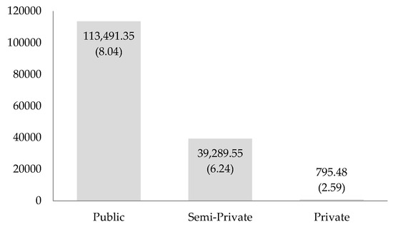 Significant differences (95% confidence level) were observed in terms of rates of glass recycled per student according to school category (F = 3.245; df1 = 2; df2 = 86; p = 0.043; = 0.191). Figure 1 compares the total quantity and rate per student (in parentheses) of recycled glass according to the school category. Public schools recycled the most, with a total quantity of 113,491.35 kg (74%), an average of 2527.46 kg of glass/school (SD = 3810.45), and a rate of 8.04 kg of glass/student.