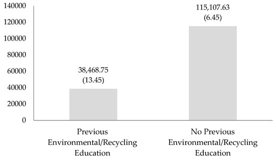 Significant differences (95% confidence level) in glass recycling rates per student were also detected as a function of previous environmental/recycling education in schools (F = 4.102; df1 = 1; df2 = 87; p = 0.046; = 0.154). Figure 2 compares the total quantity and rate per student (in parentheses) of recycled glass according to previous environmental/recycling education. Schools with previous training recycled the least in terms of total amount of glass collected, which was 38,468.75 kg (25.05%); however, they obtained a higher average collection per school, with 4019.91 kg of glass (SD = 4960.06) and a higher recycling rate per student (13.45 kg of glass/student).