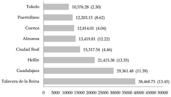 According to geographic location, there were also significant differences (95% confidence level) in glass recycling rates per student (F = 2.362; df1 = 7; df2 = 81; p = 0.030; = 0.169). Figure 3 compares the total quantity and rate per student (in parentheses) of recycled glass according to geographic location. Schools from the municipality of Talavera de la Reina recycled the most, with a total quantity of 38,468.75 kg of glass (25.05%), an average of 4019.91 kg of glass/school (SD = 4960.06), and a rate of 13.45 kg of glass/student.