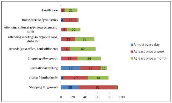 Of interest is the frequency with which a respondent participates in various out-of-home activities. The set of activities included in the survey was meant to cover most of the daily activities of people past retirement age (67 years and older): grocery shopping, shopping for other goods, doing errands (bank, post office, pharmacy), health care (doctor, dentist, physiotherapist), recreational outdoor walking, doing (organized) exercise (indoors), visiting friends and family, attending meetings in organizations or clubs, and attending the cinema, theatre, concerts and/or restaurants and cafés.