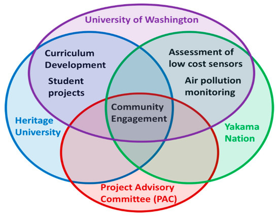 University of Washington (UW) partnered with the Yakama Nation Environmental Management Program (EMP) and local institutions, Heritage University and White Swan High School, to develop CEnR on wood smoke, called Next Generation Sensors and Scientists (NextGenSS). NextGenSS had two main activities: to develop air quality research relationships with Yakama Nation, and to train Heritage University students to mentor White Swan High School students to design and implement their own research projects regarding air quality using low-cost air sensors. The NextGenSS team worked with a Project Advisory Committee (PAC) consisting of community partners. Heritage University and White Swan High School are located in rural towns on the Yakama Nation Reservation, about 2.5 hours’ drive from UW in Seattle.