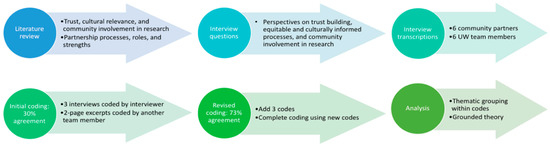 Interview development and analysis steps are outlined in Figure 2. Interview questions were formulated from a literature review examining the relationships between trust, cultural relevance, and community involvement in research with partnership processes, roles, and strengths. Interview questions are included in Supplementary Materials (S1). Twelve semi-structured interviews were conducted with individuals from the community–academic partnership: 5 PAC members (out of 7), 6 UW research team members (out of 6), and 1 academic partner from Heritage University (out of 2). Because Heritage University is small and has strong ties in the surrounding rural Yakima Valley community, for the purposes of this analysis this academic partner was categorized as a community partner. Interviews lasted from 22 to 90 minutes, were either in-person or over the phone, and were recorded with participants’ permission. All interviews occurred between September and December 2017. Prior to any interviews, this study was submitted to the UW IRB (STUDY00003057) and US EPA Human Subjects Regulations (HSR-000925) review and was determined by both to be exempt on the 28th August, 2017 and 12th September, 2017, respectively. All subjects gave their informed consent for inclusion before they participated in the study.