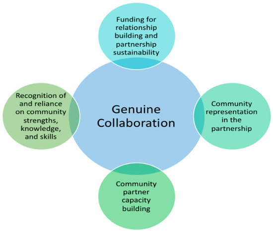 Four themes were identified as important elements of genuine collaboration (Figure 3): (1) funding for relationship building and partnership sustainability, (2) community representation in the partnership, (3) recognition of community strengths (including relying on community partner knowledge and skills), and (4) community partner capacity building.