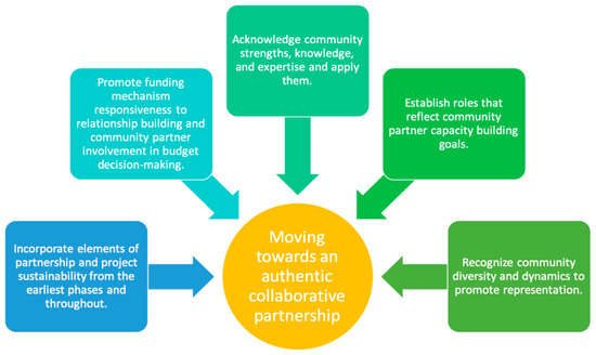 Based on the results and discussion of community and academic partner interviews, actions that support genuine collaboration include (1) incorporating elements of partnership and project sustainability from the earliest phases and throughout, (2) promoting funding mechanism responsiveness to relationship building and community partner involvement in budget decision-making, (3) acknowledging community strengths, knowledge, and expertise and applying them, (4) establishing roles that reflect community partner capacity building goals, and (5) recognizing community diversity and dynamics to promote representation (Figure 4).