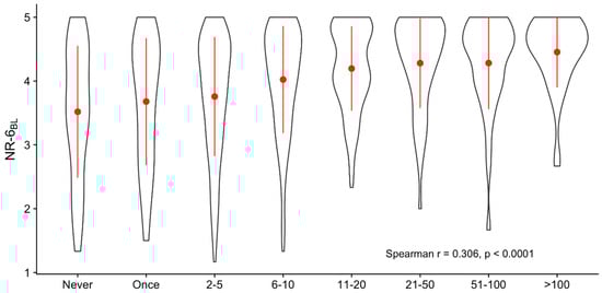 Distribution of nature relatedness depending on frequency of lifetime psychedelic use. A positive correlation was found between nature relatedness at baseline (NR-6BL) and lifetime psychedelic use. Red dots and lines represent mean ± SD.