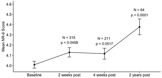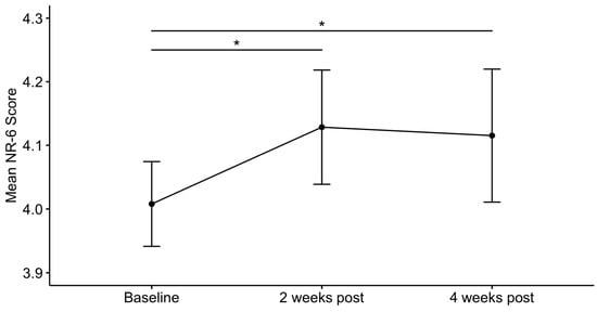 A first confirmatory GLMM revealed a significant main effect of time on NR-6 scores (β = 0.009, p = 0.014, Figure 2), indicating an increase in nature relatedness post-psychedelic use. Tukey post hoc tests showed that nature relatedness was significantly higher both two weeks (NR-62W = 4.13, SD = 0.81, z = 2.208, p = 0.027) and four weeks (NR-64W = 4.12, SD = 0.77, z = 2.253, p = 0.024) after the experience, when compared with the baseline (NR-6BL = 4.01, SD = 0.87), and did not change between the two endpoints (z = 0.367, p = 0.714); thus, confirming the prior hypotheses.