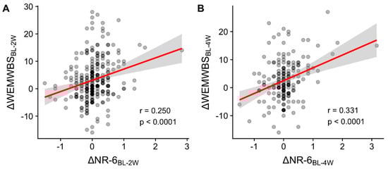 Pearson correlations between the difference scores for nature relatedness and well-being at each of the endpoints revealed significant positive associations between ΔNR-6 and ΔWEMWBS, i.e., nature relatedness and well-being changed concomitantly. In terms of effect size, this association was moderate for the four-week change scores (r = 0.331, p < 0.0001, Figure 3A) and weak for the two-week change scores (r = 0.250, p < 0.0001, Figure 3B).