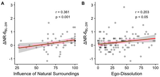 Nature relatedness (NR-6) changes from before to after a psychedelic experience are predicted by acute state and setting. Increase in nature relatedness two weeks (2W) post-psychedelic vs. (A) perceived influence of natural surroundings during the experience and (B) extent of ego-dissolution during the experience.