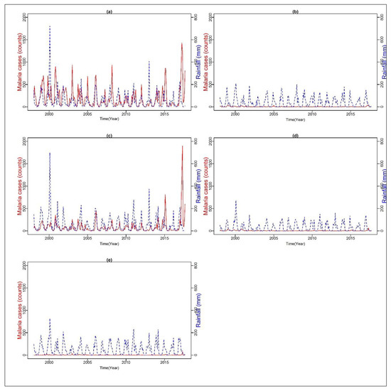 Time series of monthly malaria cases count on left Y-axis (Redline) and rainfall mm on right Y-axis (Blueline) over (a) Vhembe, (b) Waterberg, (c) Mopani, (d) Capricorn, and (e) Sekhukhune from 1998–2017.