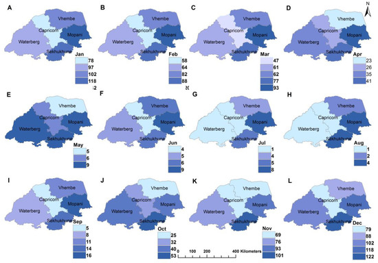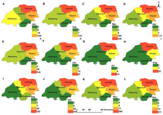 Spatial-temporal distribution of monthly malaria cases in Limpopo Province, 1998–2017, A–L representing January to December respectively.