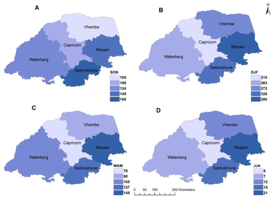 As indicated in the wavelet analysis Figure 7a–e, the less significant correlation between rainfall and malaria cases in Capricorn, Waterberg, and Sekhukhune districts may be because of other unfavorable conditions influencing malaria transmission in the regions which are not considered in this study. It could also be that malaria control practices (such as indoor residual spraying) are more productive in these districts. A time lag of one to three months has been established between rainfall and malaria incidence in Limpopo Province [37]. Additionally, [9] has shown that monthly mean minimum temperature and monthly total rainfall can account for about 65% variation in malaria transmission at the two-month lagged effect in Mutale, a local municipality in Vhembe district of Limpopo. The results of the seasonal and wavelet analysis suggest that the transmission of malaria can be expected in the summer months when about 40–55 mm of rainfall is received in the spring months (SON) with other favorable conditions fulfilled.