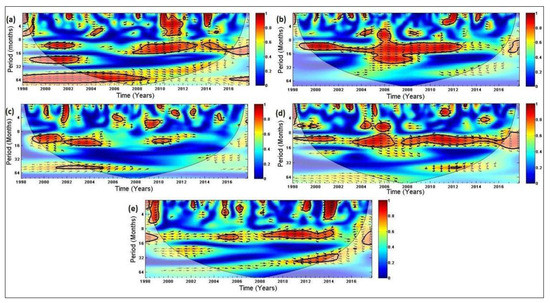 Wavelet cross-coherence of rainfall and malaria cases of (a) Capricorn, (b) Mopani, (c) Sekhukhune, (d) Vhembe, and (e) Waterberg district from 1998–2017. The arrows indicate the relative phasing of the variables, while the faded regions represent the cone of influence and are not considered for the analyses.